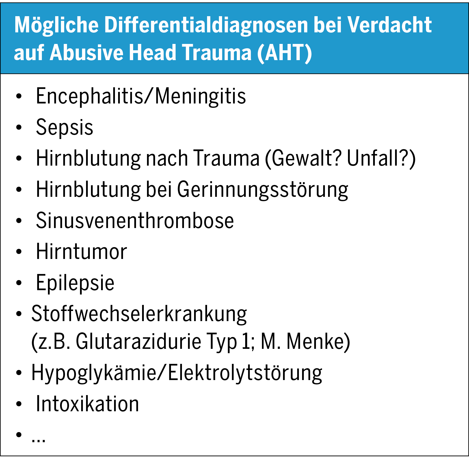 In dieser Situation galt es primär, das Kind zu stabilisieren, als erstes die gefährlichen und häufigen Diagnosen zu suchen beziehungsweise auszuschliessen und die allenfalls nötige Therapie einzuleiten. Differentialdiagnostisch wurden hier unter anderem eine Meningitis, eine Hirnblutung nach Trauma oder bei Gerinnungsstörung, ein epileptisches Geschehen oder eine Hypoglykämie in Erwägung gezogen. Siehe dazu die Tabelle 1.