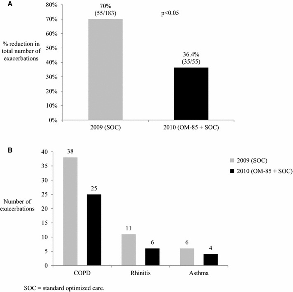 A Rückgang der Anzahl von pulmonalen Exazerbationen in den Jahren 2009 (versus 2008) und 2010 (versus 2009) unter einem Bakterienlysat zusätzlich zur Standardtherapie (mit Genehmigung von (38)).