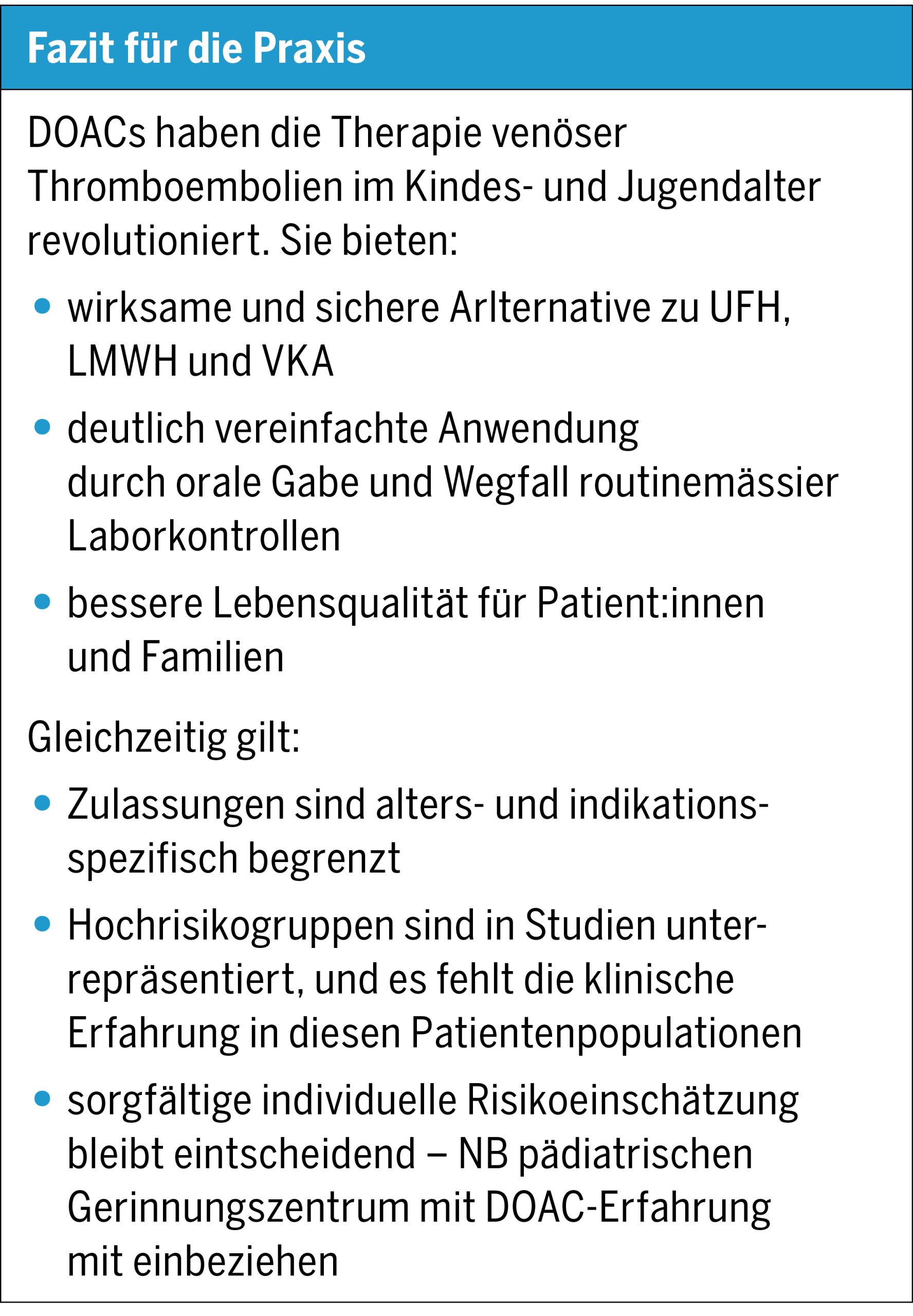 Thromboembolische Ereignisse bei Kindern und Jugendlichen sind zwar selten, ihre Häufigkeit nimmt jedoch zu. Mit der Einführung direkter oraler Antikoagulanzien (DOACs) hat sich in der Erwachsenenmedizin ein Wandel vollzogen, der nun auch die Pädiatrie erreicht hat. In der Schweiz ist Rivaroxaban für die Behandlung und Sekundärprävention venöser Thrombosen bei Kindern zugelassen, Apixaban, Dabigatran und Edoxaban sind in der Schweiz in der Pädiatrie (noch) nicht zugelassen. Die verfügbaren Studien zeigen eine vergleichbare Wirksamkeit und Sicherheit gegenüber Heparinen und Vitamin-K-Antagonisten, bei gleichzeitig deutlich vereinfachter Handhabung. Erste Daten zu speziellen Indikationen wie kardiologischen oder onkologischen Hochrisikopatient:innen liegen vor, sind jedoch noch nicht flächendeckend in die Zulassung eingeflossen. DOACs tragen wesentlich zur zunehmenden Individualisierung der Thrombosebehandlung im Kindesalter bei, und werden sowohl im stationären als auch im ambulanten Bereich angewendet.
