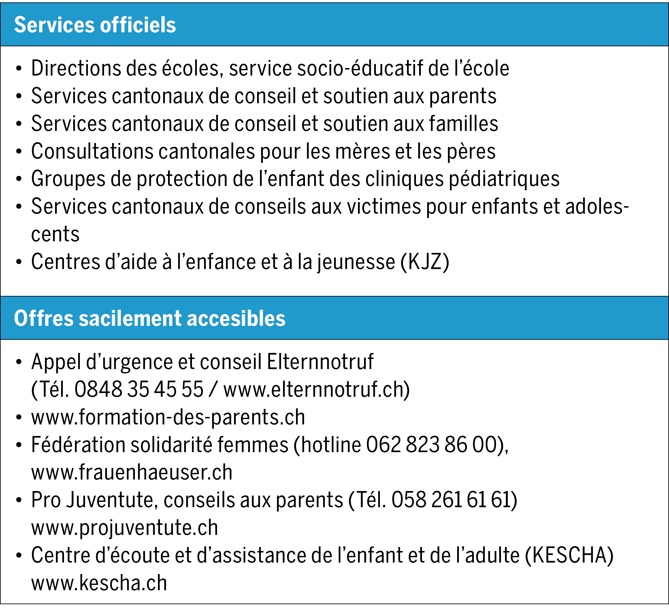 Dans ces situations difficiles sont disponibles plusieurs centres d’écoute, tant officiels que sous forme de contacts facilement et rapidement accessibles. Un choix est présenté dans le tableau 1.