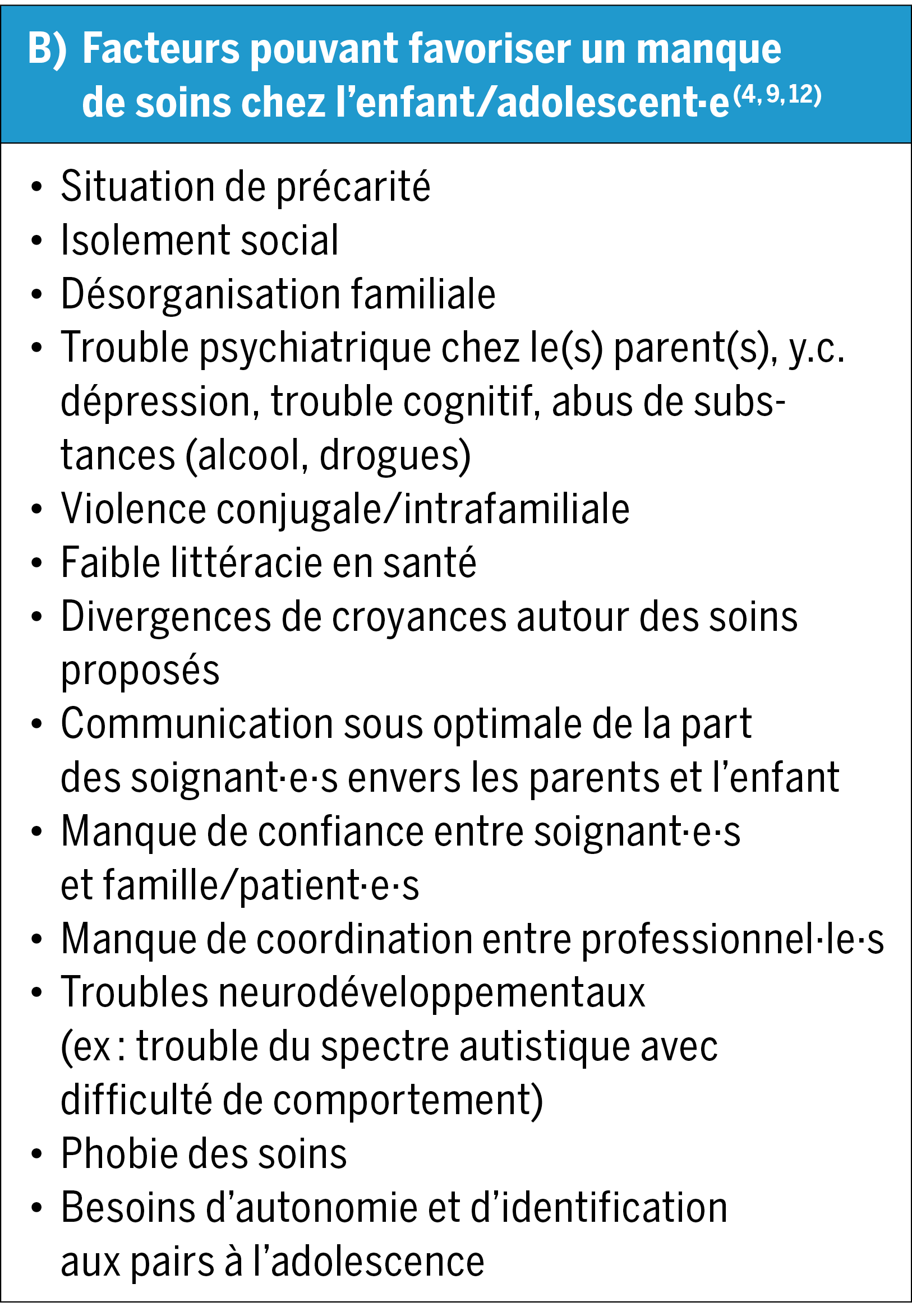 Les facteurs pouvant favoriser un manque de soins peuvent être sociétaux, parentaux, liés aux soignant·e·s et propres à l’enfant(4, 9, 12) (Cf tableau B) et doivent être pris en considération dans l’évaluation de toute situation. Il est notamment primordial de s’assurer de l’accès aux soins et de la compréhension de l’avis médical donné (12). Dans une récente étude australienne, des difficultés de communication ont été identifiées dans 100% des cas référés à l’équipe hospitalière de protection de l’enfant pour négligence médicale, et des difficultés matérielles dans 80% des cas(14).