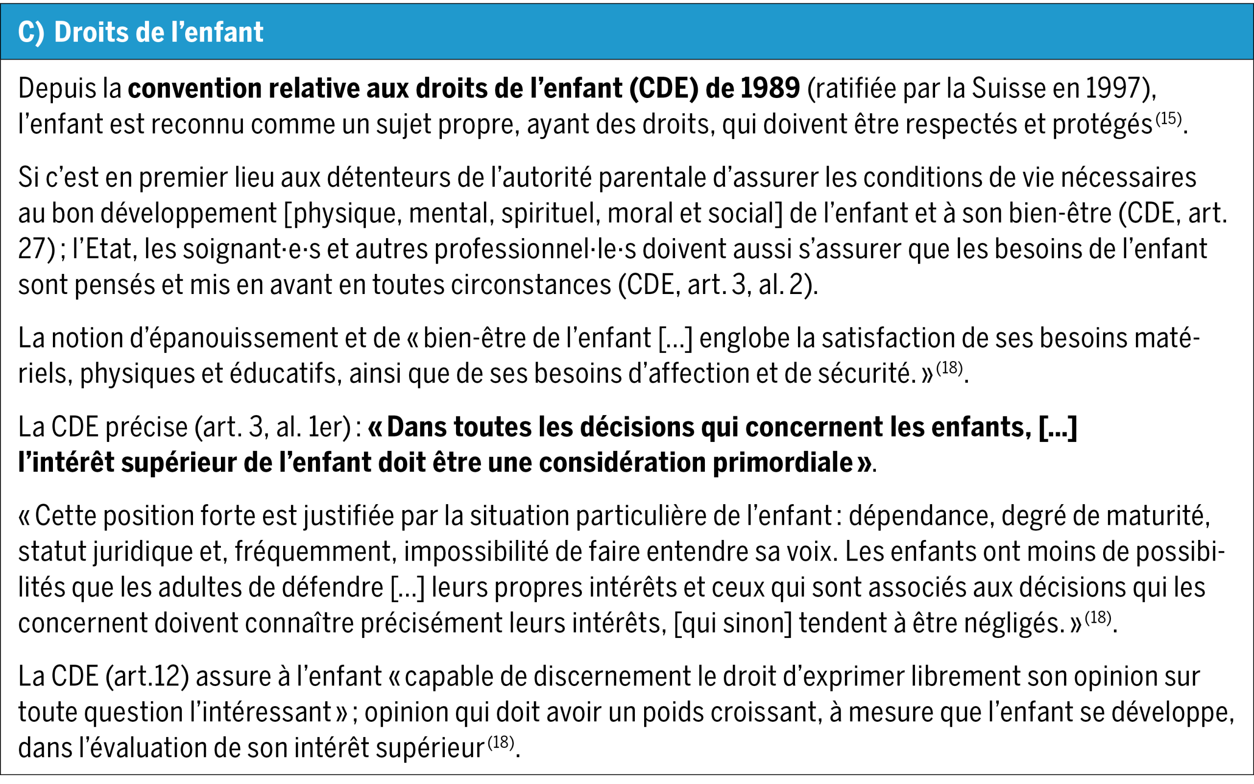 L’intérêt supérieur de l’enfant doit être placé au centre de toute réflexion et/ou décision, que ce soit par ses parents ou par les professionnel·le·s ; et l’enfant doit pouvoir participer à sa détermination (cf encadré C)(15).