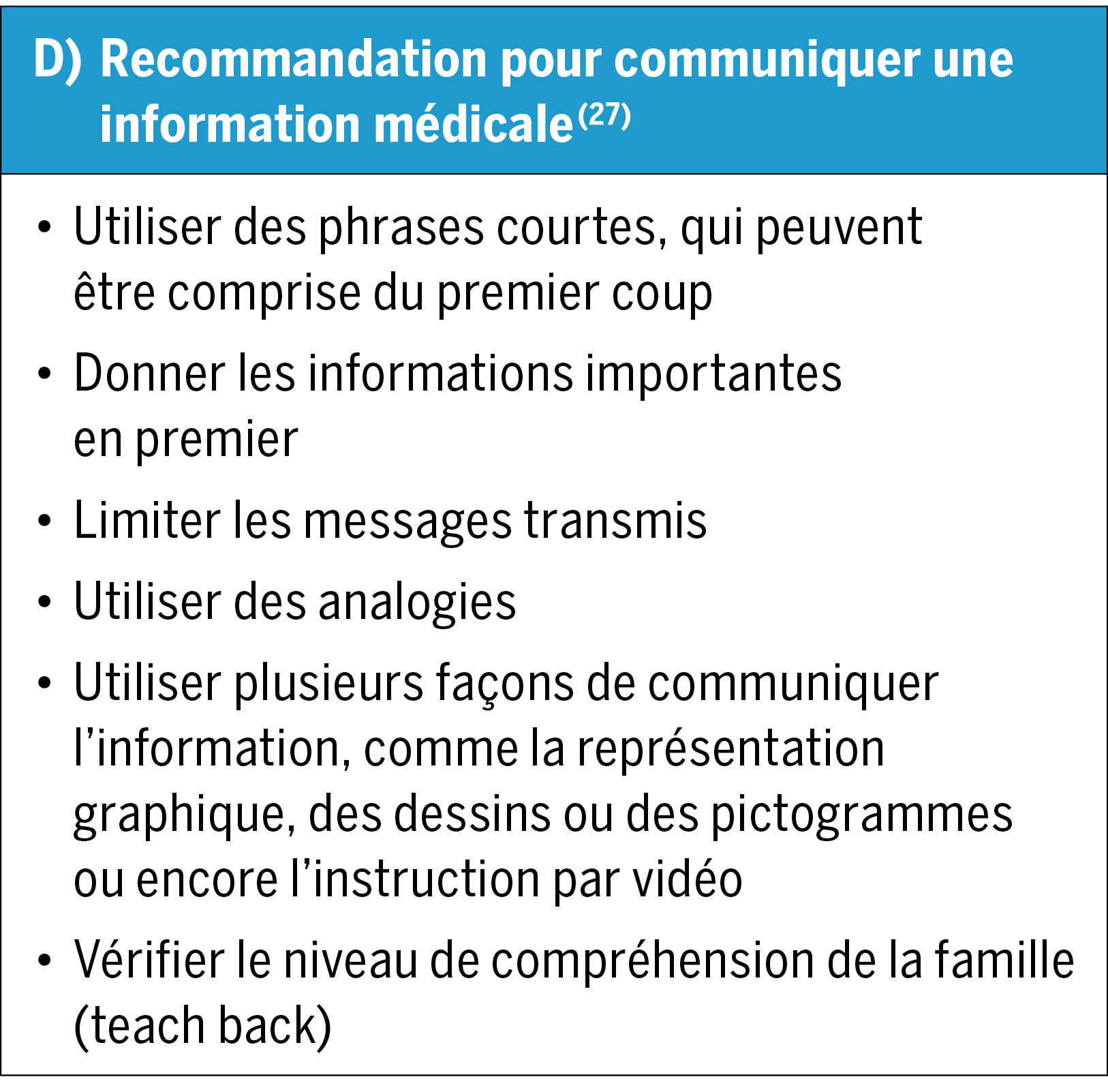 Une transmission d’information dite « universelle » et accessible à tous est recommandée, plutôt que d’évaluer de manière formelle le niveau de LS des patient·e·s(27, 29). Des conseils de communication sont décrits dans l’encadré D. Il est essentiel que les informations puissent être données dans une langue compréhensible par les parents et de faire appel à un·e interprète si nécessaire(30).