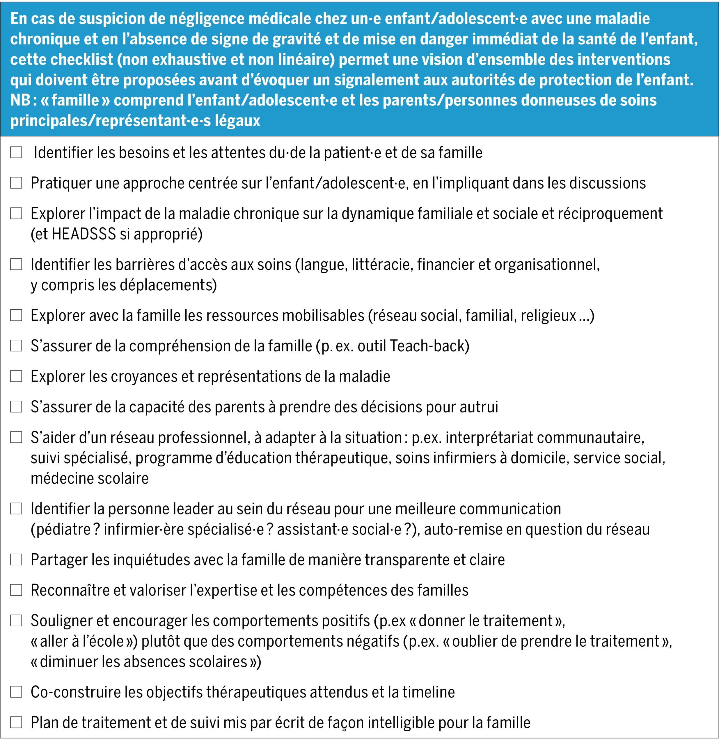 Les suspicions de négligence médicale dans un contexte de maladie chronique sont des situations complexes, qui doivent être appréciées de manière globale et systémique, en intégrant des principes légaux, éthiques et transculturels, tout en remettant en question notre propre rôle en tant que soignant·e. En effet, nous pouvons aussi participer, malgré nous, à un manque de soins à l’enfant, par exemple, par un manque de communication appropriée ou de considération des barrières d’accès aux soins.