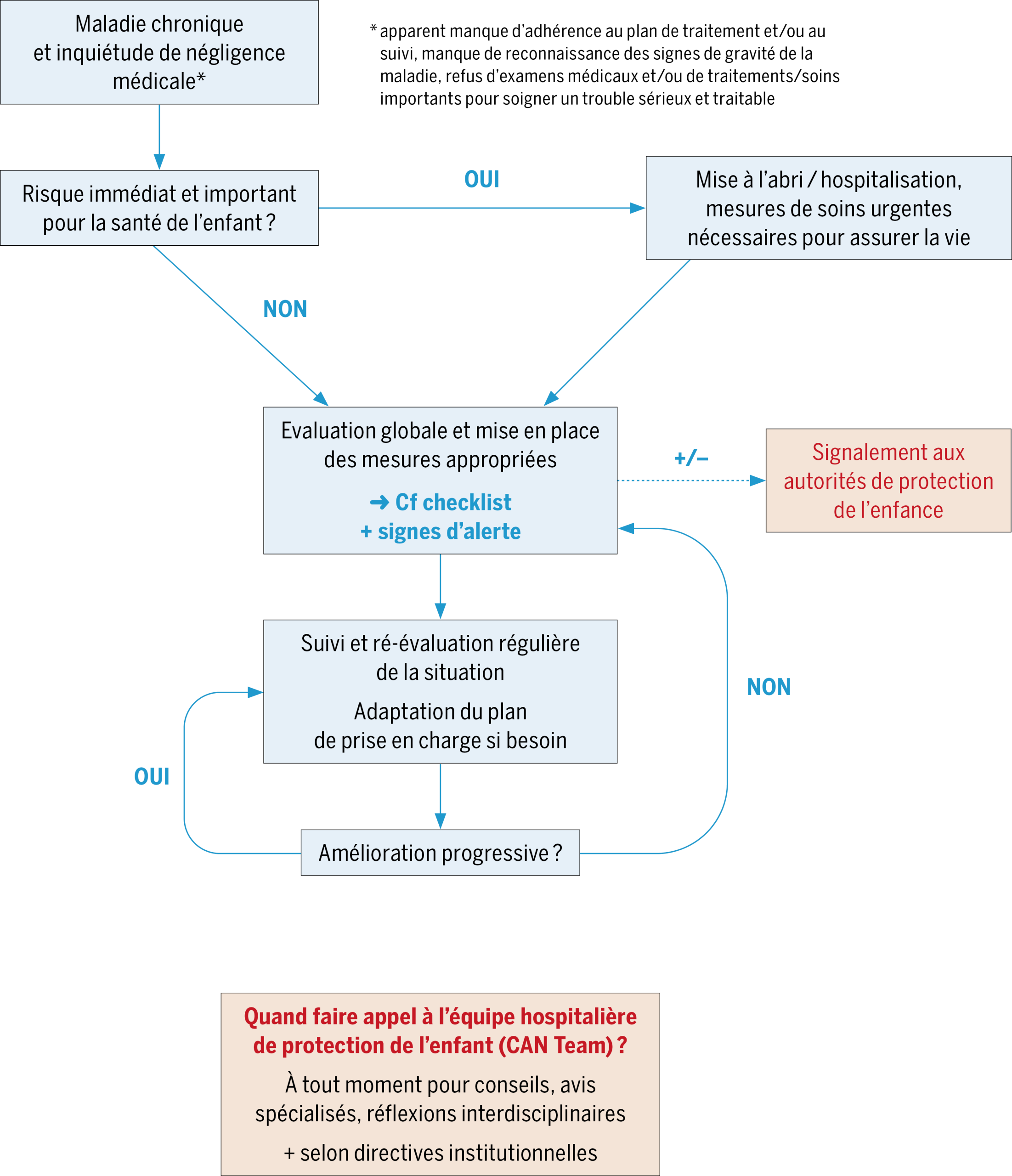 La négligence médicale est généralement définie comme un manque de réponse aux besoins médicaux de l’enfant, de la part de ses parents, avec un impact sur sa santé. Elle doit être évoquée en cas de manque ou refus de soins et/ou d’examens nécessaires au diagnostic d’une condition médicale traitable à risque de conséquences invalidantes ; alors même que le bénéfice anticipé du traitement, ou de l’examen, est significativement supérieur à sa morbidité(4, 12). Dans le cadre d’une maladie chronique, elle peut aussi être évoquée en cas d’absence d’évolution favorable escomptée, de peine à reconnaître les signes de sévérité clinique, d’environnement non adéquat (p.ex. en cas d’asthme, la persistance d’exposition au tabac ou à des allergènes connus, comme dans la situation de Luan) et/ou de manque de supervision de l’enfant dans la gestion de sa maladie(5, 9).