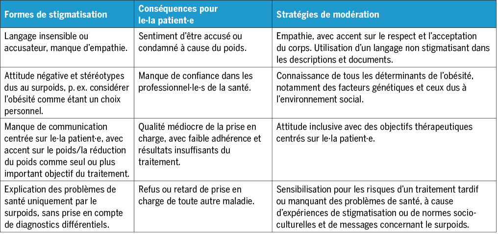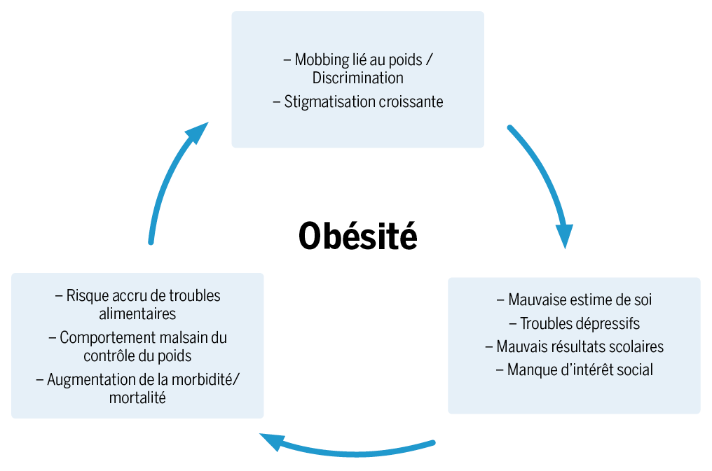 Les pédiatres et toutes les professions en contact avec les enfants et adolescent·e·s obèses (par ex. enseignant·e·s) ou impliqué·e·s dans leur prise en charge (p.ex. diététicien·ne·s, physiothérapeutes) doivent être conscient·e·s des deux formes de stigmatisation et de leur rôle dans l’augmentation du stress et l’aggravation de l’état de santé des personnes en surpoids(35) :