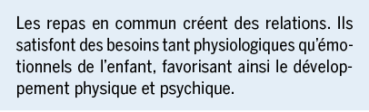 La manière dont les repas sont réalisés durant la petite enfance, influence le comportement alimentaire ultérieur(2). Les enfants pour qui les repas sont régulièrement associés au stress ou aux conflits, développent plus fréquemment une relation perturbée à l’alimentation. Une alimentation émotionnelle, où l’on mange pour se réconforter ou faire face à des émotions négatives, s’enracine dès la petite enfance et peut favoriser plus tard l’apparition de troubles alimentaires comme l’hyperphagie boulimique. Une alimentation irrégulière ou non structurée, par exemple l’absence de repas en commun, représente également un facteur de risque important pour les troubles de l’alimentation et de la nutrition de la petite enfance. Des études montrent que les enfants qui prennent régulièrement leurs repas en famille à la maison, ont plus de chances d’avoir un poids normal et sont moins enclins à une consommation excessive de sucre(3). Cela souligne l’importance de la culture alimentaire familiale et du rôle des parents en tant que modèle pour l’acquisition de bonnes habitudes alimentaires.