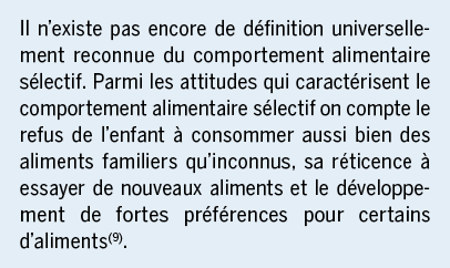 Lorsqu’ils doivent choisir leurs aliments, les enfants préfèrent généralement les saveurs familières et optent donc pour des aliments connus. Ce comportement sélectif est l’un des modèles alimentaires les plus fréquents chez les petits enfants et constitue un obstacle à une alimentation équilibrée(8). La prévalence du comportement alimentaire sélectif est estimée entre 5,6% et 47%, la large variation étant due aux différentes méthodes d’évaluation, aux groupes d’âge étudiés et aux contextes culturels.