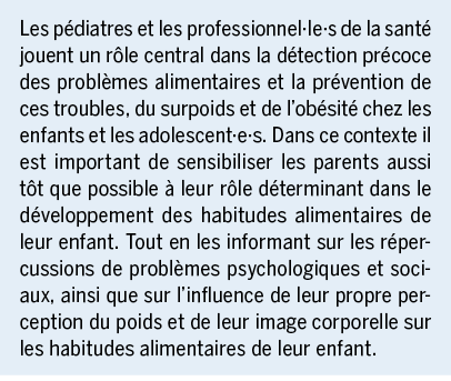 La perception du surpoids de leur enfant par les parents impacte fortement son bien-être et son estime de soi. En retour, le niveau de fonctionnement psychosocial, le bien-être émotionnel et la perception de soi et de son corps ainsi que les comorbidités psychiques des enfants et adolescent·e·s en surpoids influencent leur motivation à changer et donc le succès du traitement. Il est donc primordial de soutenir ces enfants et adolescent·e·s en surpoids dans ces aspects. Enfin, l’attitude des parents vis-à-vis du poids et de l’alimentation a une influence déterminante sur les comportements alimentaires des enfants, indépendamment de leur poids. Ces aspects doivent être abordés aussi bien dans le suivi pédiatrique de routine que dans la prise en charge de l’obésité infantile.