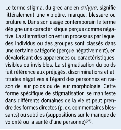 La stigmatisation des personnes en surpoids ou obèses est très répandue et reste une forme de discrimination largement acceptée, y compris parmi les professionnel·le·s de la santé. Elle repose souvent sur un discours culpabilisant et la croyance erronée qu’adopter un mode de vie sain est simple et accessible à tous, sans contraintes ni conséquences négatives(22-24).