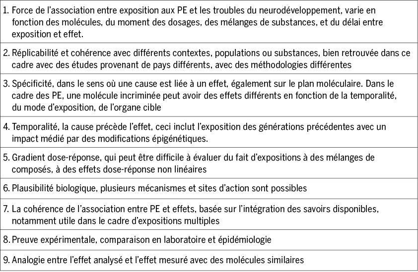 Néanmoins, il existe des limites dans l’établissement d’un lien causal entre l’exposition précoce à une ou des substances et l’apparition de troubles ou de maladies à plus long terme. Le Dr Bradford Hill, qui a démontré le lien entre exposition au tabac et cancer du poumon, a établi, en 1965, 9 critères de causalité ; ils ont été adaptés en 2014(19), pour tenir compte de l’évolution des connaissances, des techniques d’analyse moléculaire et des méthodologies statistiques. En suivant ce cadre d’analyse, la plausibilité d’une causalité entre exposition précoce aux PE et TND peut être évaluée de la manière suivante :