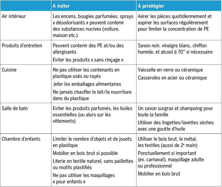 Les pédiatres ont une opportunité unique d’accompagner les familles, disait Brazelton(26). Une partie des parents est déjà sensibilisée aux questions liées à l’environnement en général et aux PE en particulier, parfois au point de développer une forme d’éco-anxiété. D’autres restent insuffisamment informés. Tous peuvent bénéficier d’un dialogue avec les professionnel·le·s de la santé, afin d’être accompagnés dans une démarche de réduction des expositions potentiellement néfastes. Il est essentiel dans ce sens de proposer des mesures concrètes de prévention, simples, accessibles et efficaces, à la fois pour limiter les expositions aux PE et atténuer le sentiment d’impuissance, de culpabilité ou d’anxiété souvent associé. Ces conseils peuvent se fonder sur un nombre croissant de données scientifiques, à adapter aux différentes situations.