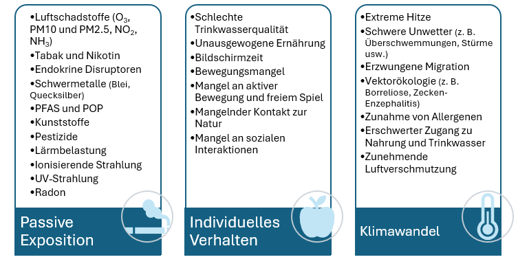 Unter Umweltrisiken verstehen wir: passive Exposition aufgrund der Umweltqualität und des Lebensumfeldes (z. B. Umweltverschmutzung), individuelles Verhalten (z. B. Ernährung, Bewegungsmangel) sowie menschliche Aktivitäten und daraus resultierende anthropogene Veränderungen (v. a. Klimawandel). Abbildung 1 zeigt Beispiele für die wichtigsten Umweltrisiken in der Schweiz. Umweltrisiken wirken sich überproportional auf Kinder aus sozial benachteiligten Gruppen aus und verstärken bestehende Ungleichheiten. Die gesundheitlichen Auswirkungen dieser Risiken können hier nicht im Einzelnen ausgeführt werden, doch aus der Referenzliteratur lassen sich viele Antworten ableiten(3-6).