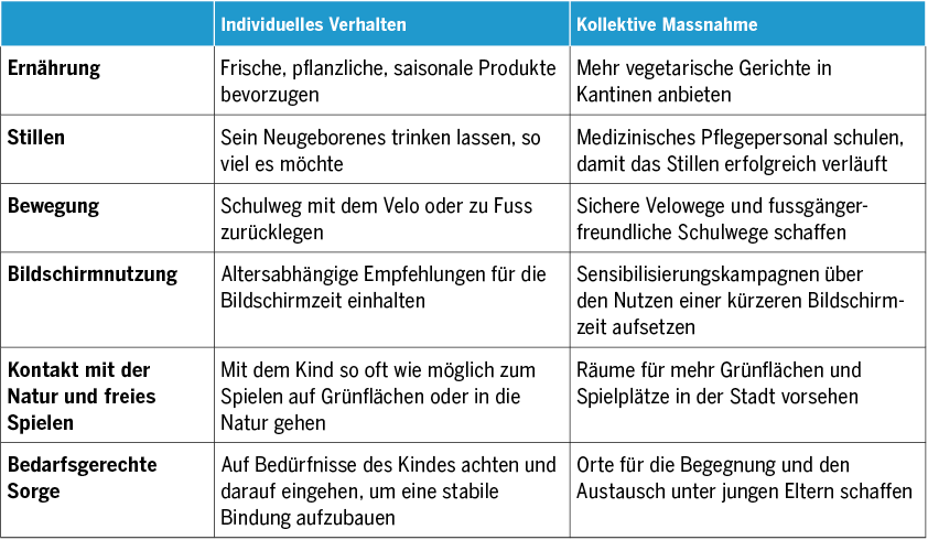 Angesichts dieser Aufzählungen kann die Umwelt wie ein Ort voller Risiken und Gefahren erscheinen. Doch die Umwelt ist vor allem eine Ressource, die günstige Bedingungen für das Leben, die Gesundheit und das Wohlergehen schafft(7), und ihre Erhaltung wiederum wirkt sich positiv auf die Gesundheit der Bevölkerung aus. So haben viele individuelle und kollektive Verhaltensweisen einen positiven Einfluss auf die Gesundheit wie auch die Umwelt – es besteht ein gegenseitiger Nutzen. Beispiele dafür finden sich in Tabelle 1. Sie können während der pädiatrischen Konsultation als gezielte Präventionsmassnahmen herangezogen werden.